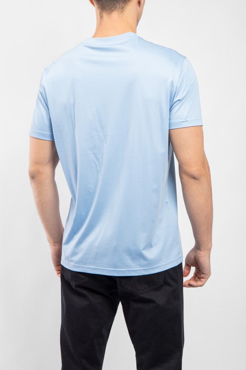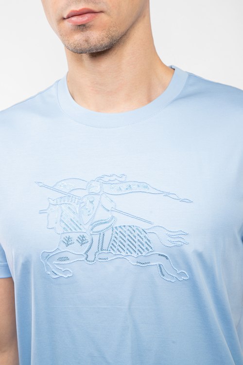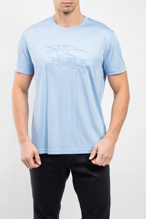 Мужская голубая хлопковая футболка от Burberry (Бёрберри). Вышивка с пайетками на груди, круглый вырез горловины, короткий рукав, классическая длина.