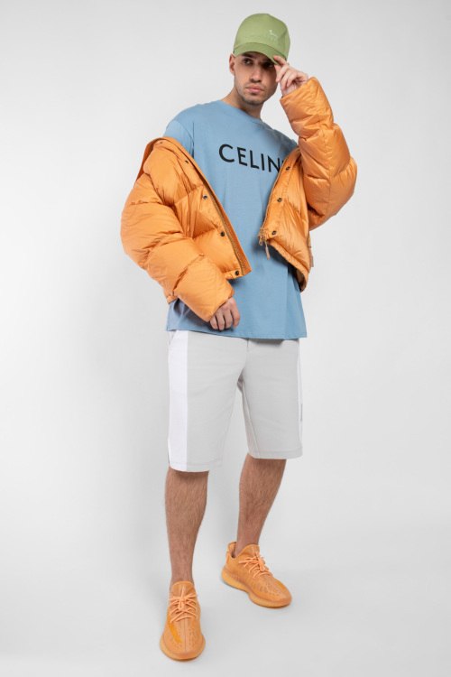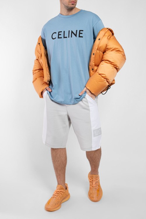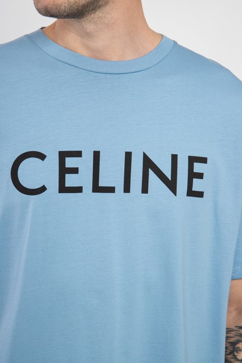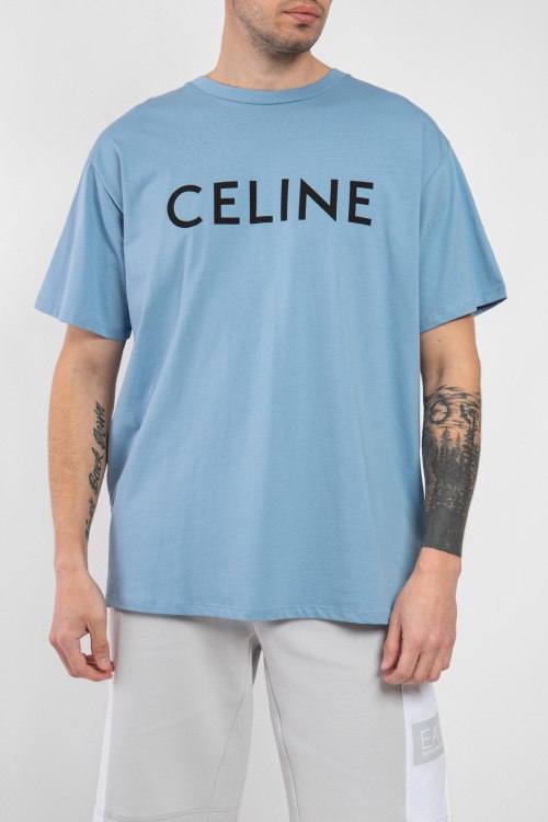 Мужская голубая хлопковая футболка от Celine (Селин). Принт с логотипом на груди, круглый вырез горловины, короткий рукав, удлиненная длина, фасон oversize.