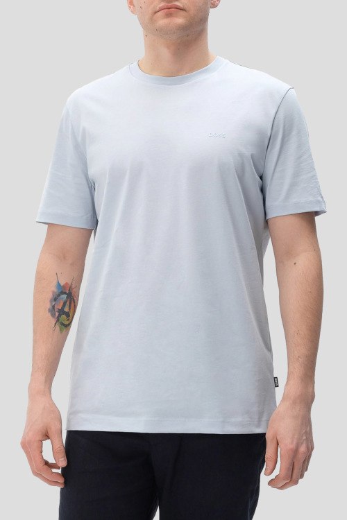 Детали: Мужская голубая хлопковая футболка Thompson от Hugo Boss (Хуго Босс). Логотип на груди, круглый вырез горловины, короткий рукав, классическая длина