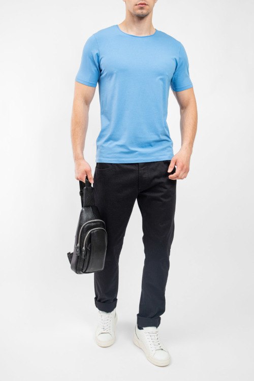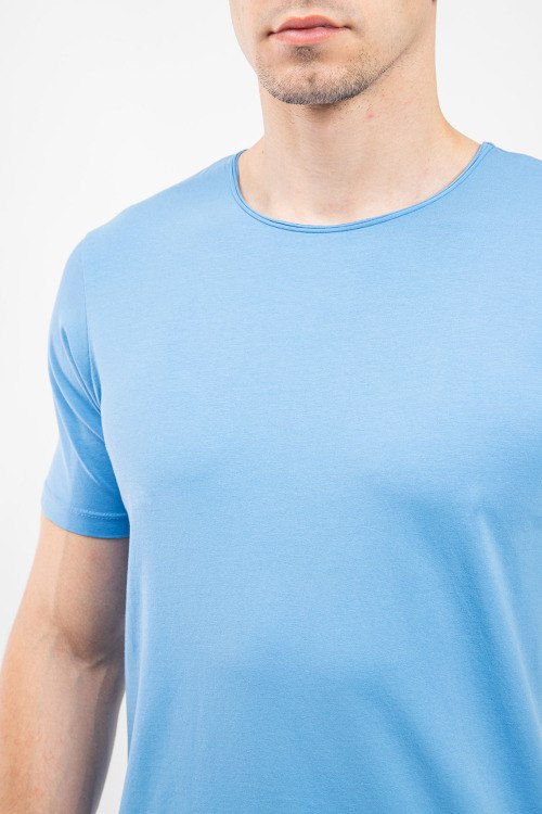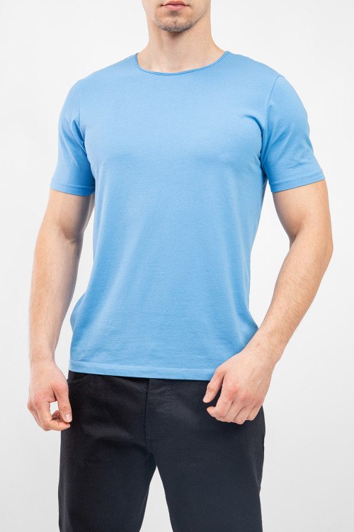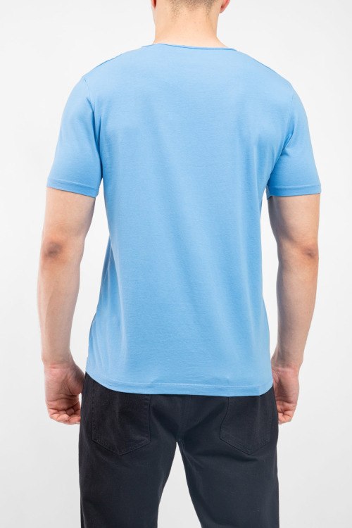 Мужская голубая футболка из хлопка от Olymp (Олимп). Классическая длина, круглый вырез горловины, короткие рукава, ровный низ изделия.