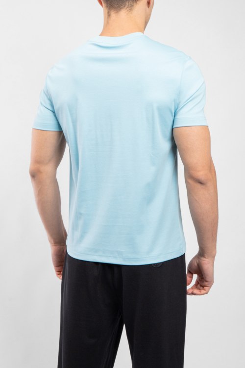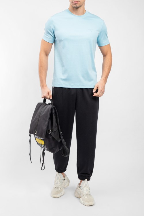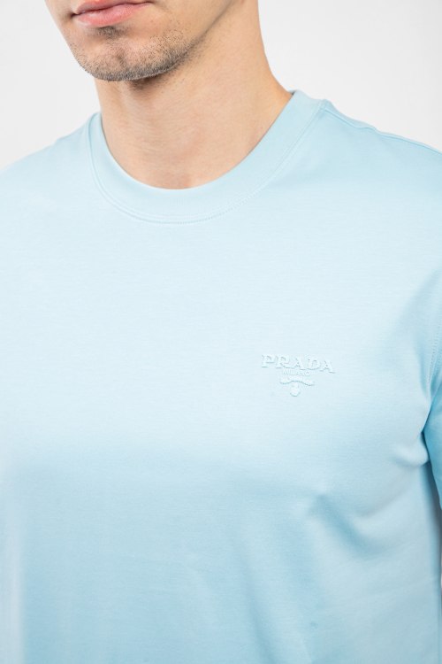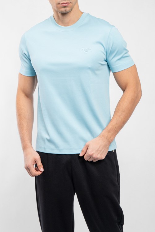 Мужская голубая хлопковая футболка от Prada (Прада). Логотип на груди, круглый вырез горловины, короткий рукав, классическая длина.