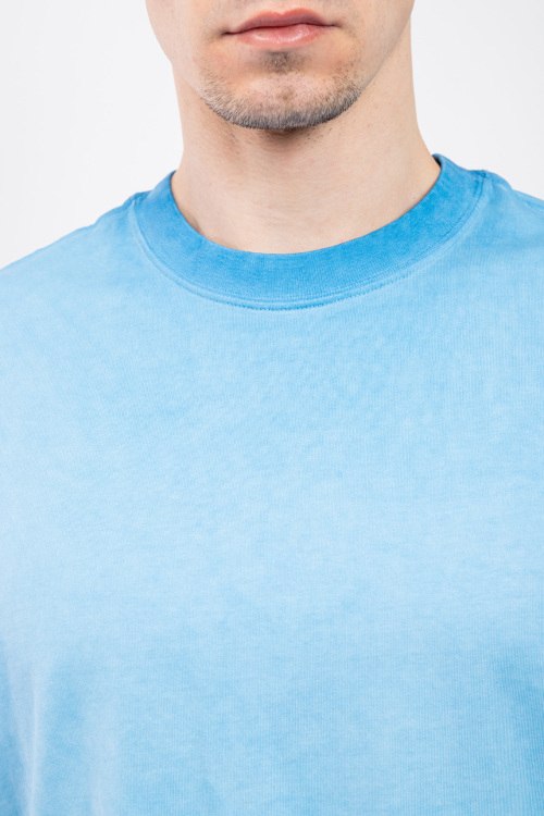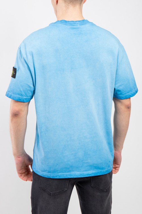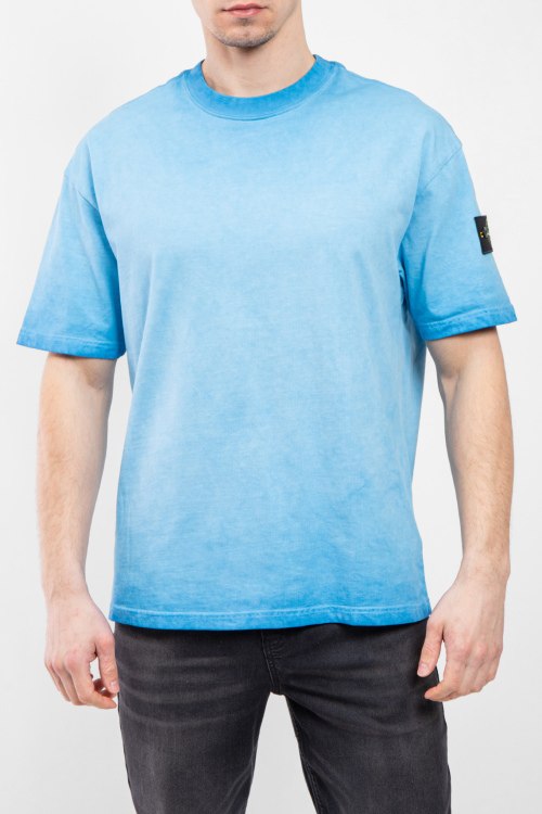 Мужская голубая футболка из хлопка от Stone Island (Стоун Айленд). Классическая длина, круглый вырез горловины, короткие рукава, патч-лого на рукаве.