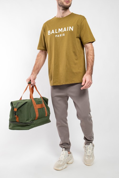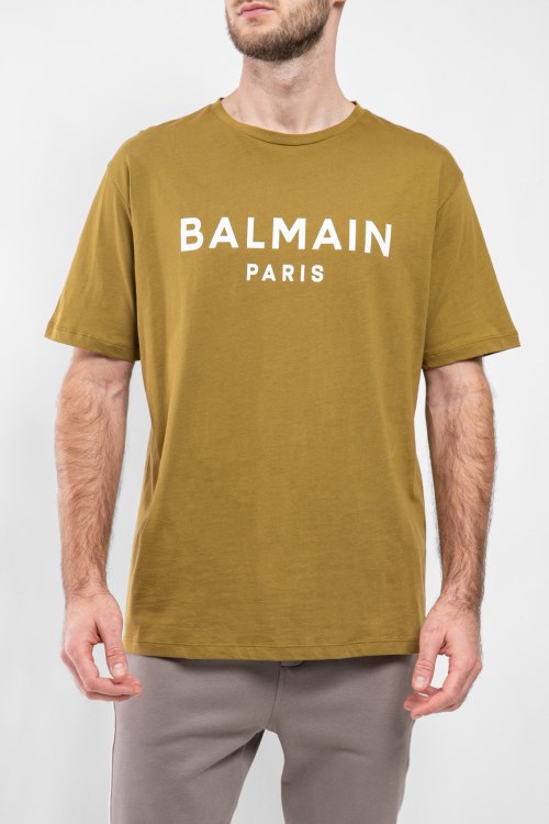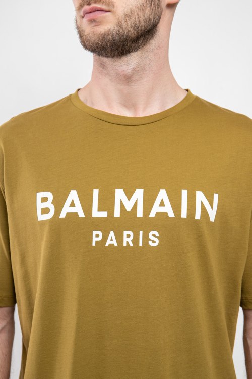 Детали: Мужская горчичная хлопковая футболка от Balmain (Бальман). Логотип на груди, круглый вырез горловины, короткий рукав, классическая длина