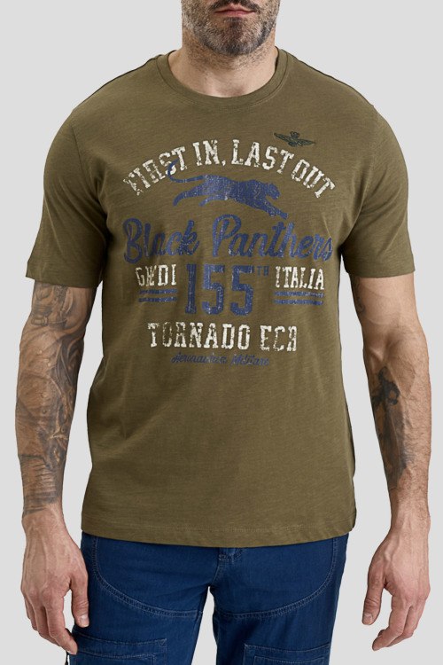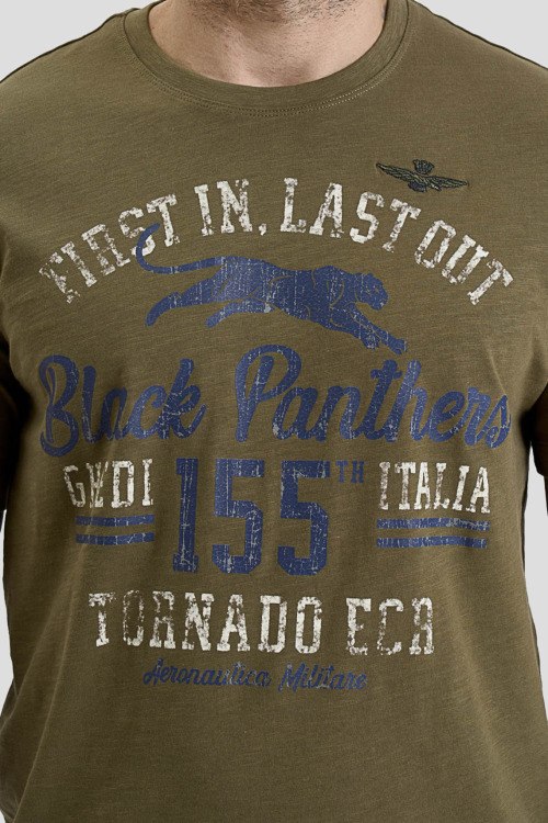 Детали: Мужская хлопковая футболка цвета хаки от Aeronautica Militare (Аэронавтика Милитари). Принт на груди, круглый вырез горловины, короткий рукав, классическая длина