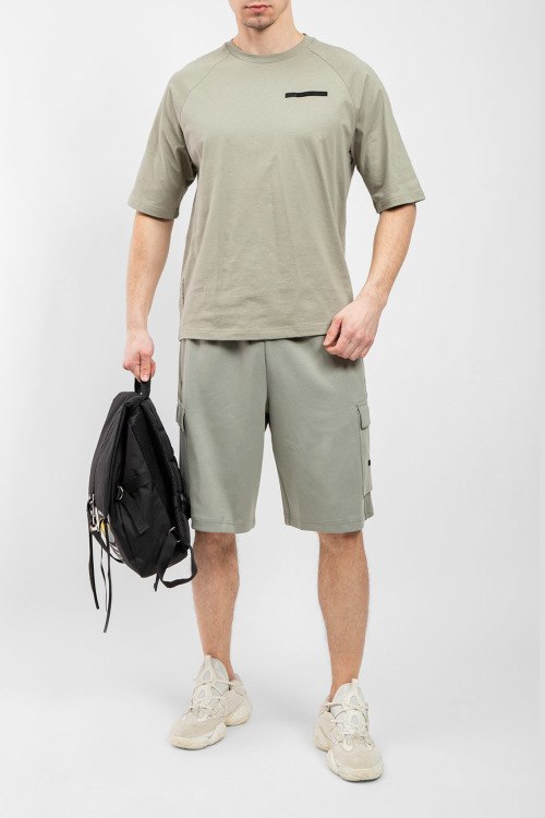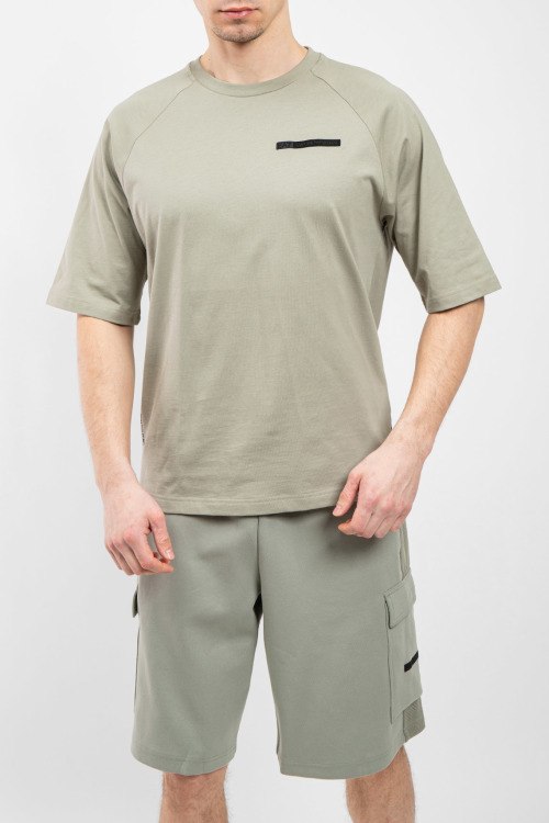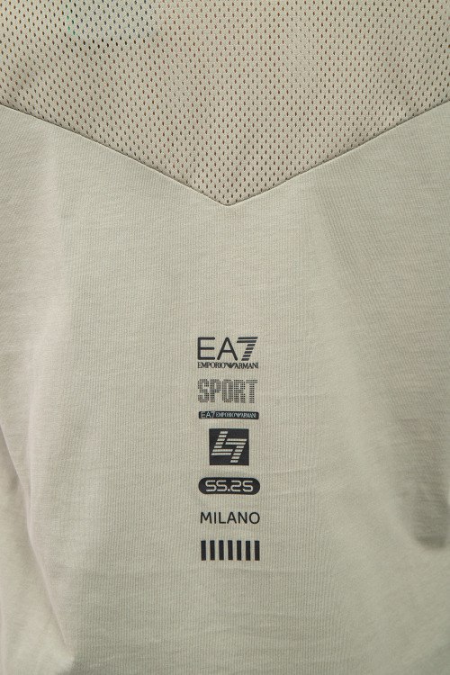 Мужская футболка цвета хаки из хлопка от EA7 Emporio Armani (ЕА7 Эмпорио Армани). Классическая длина, круглый вырез горловины, короткие рукава, перфорированная вставка, логотип бренда.