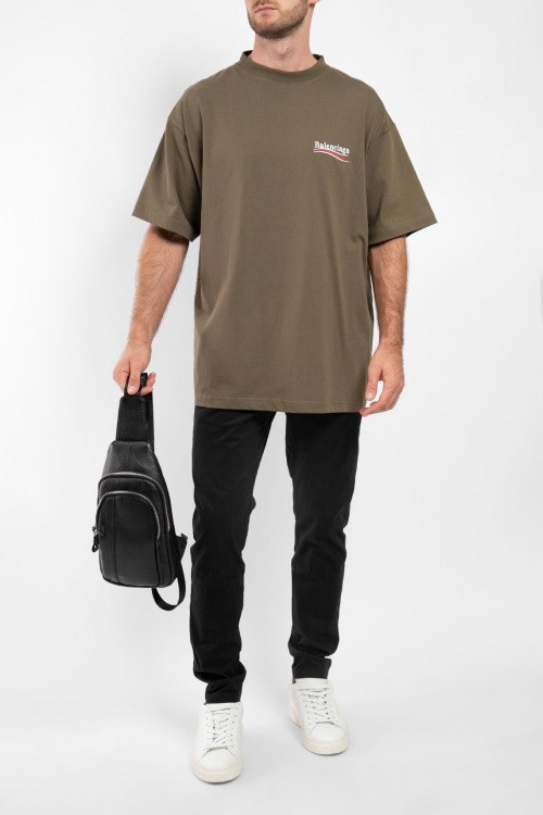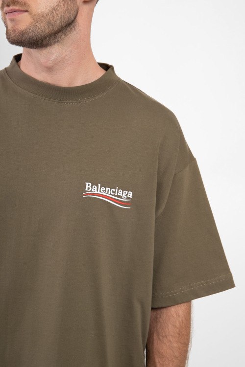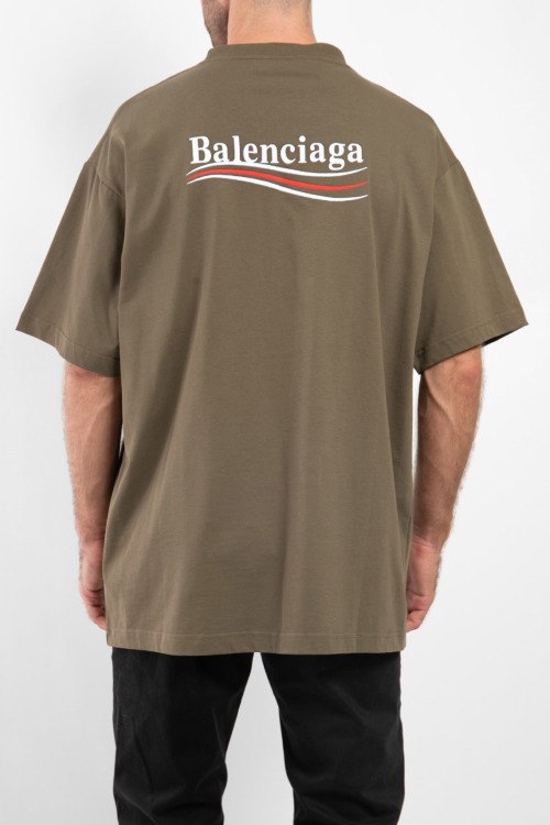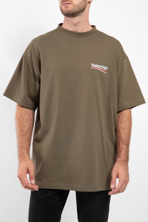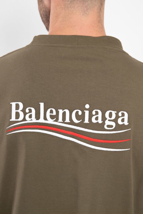 Мужская хлопковая футболка цвета хаки от Balenciaga (Баленсиага). Двухсторонний принт с логотипом, круглый вырез горловины, короткий рукав, удлиненная длина.