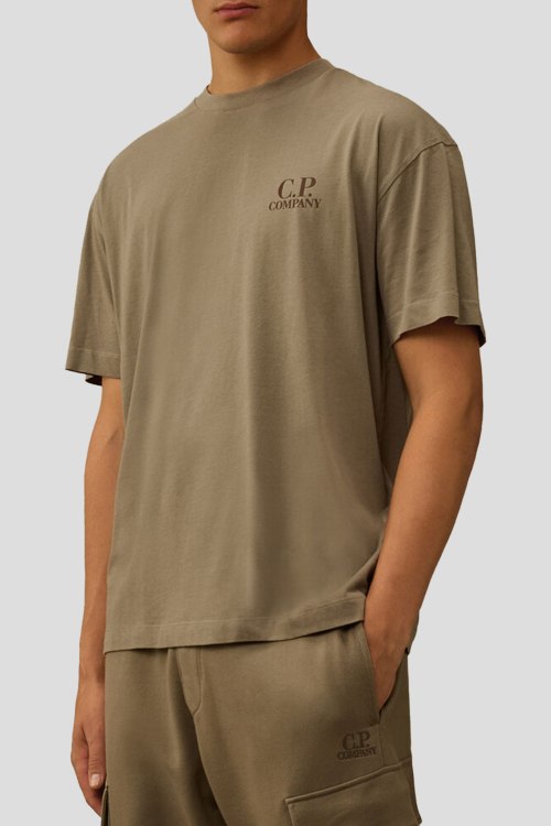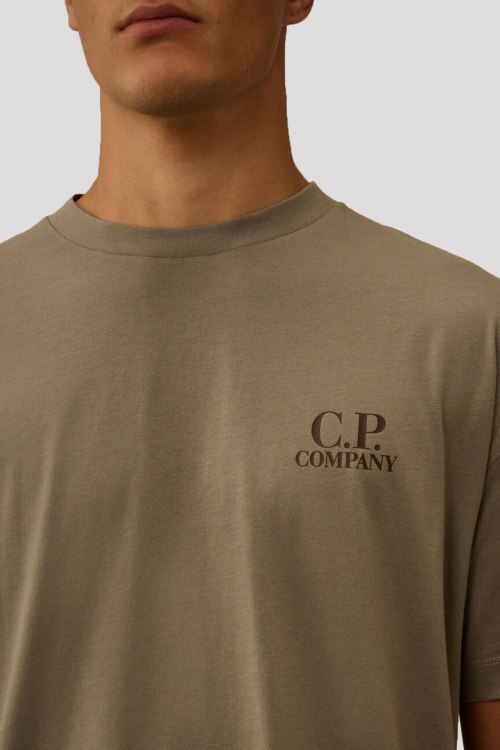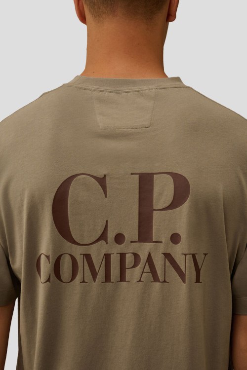 Детали: Мужская хлопковая футболка в цвете светлый хаки от C.P. Company (СиПи Компани). Логотип на груди и на спине, круглый вырез горловины, короткий рукав, классическая длина