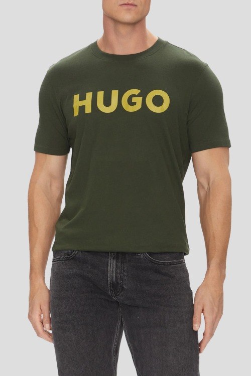 Детали: Мужская хлопковая футболка цвета хаки Dulivio от Hugo by Hugo Boss (Хуго бай Хуго Босс). Логотип на груди, круглый вырез горловины, короткий рукав, классическая длина