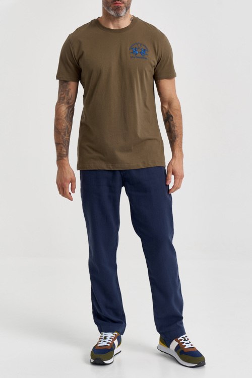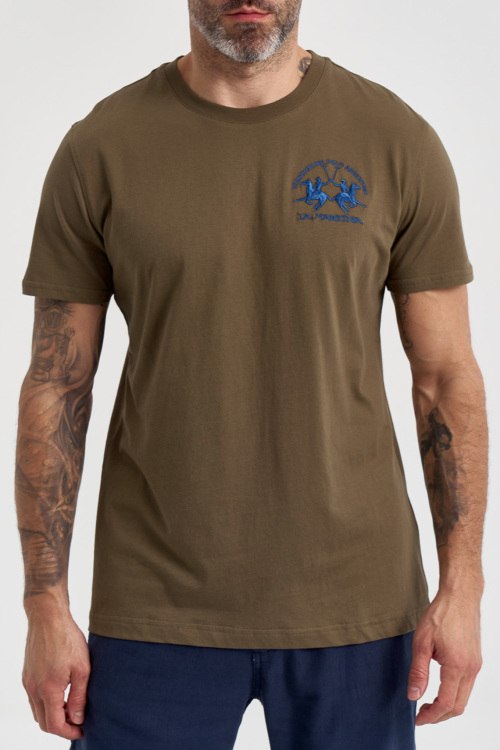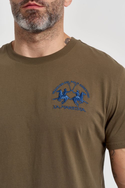 Детали: Мужская хлопковая футболка цвета хаки от La Martina (Ла Мартина). Логотип на груди, круглый вырез горловины, короткий рукав, классическая длина. Параметры модели: 103 см - 87 см - 99 см. Рост - 182 см. Размер на фото - L