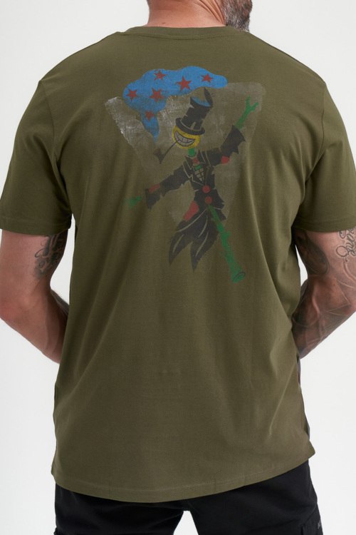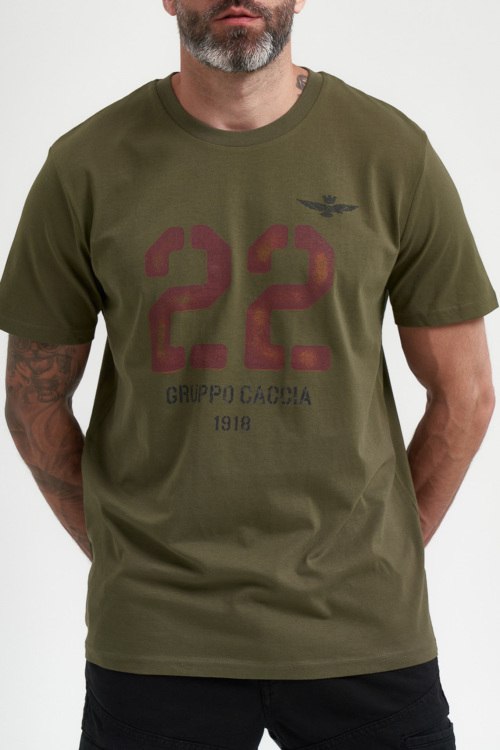 Детали: Мужская футболка цвета хаки из хлопка от Aeronautica Militare (Аэронавтика Милитари). Классическая длина, круглый вырез горловины, короткие рукава, дизайн с принтом "22 gruppo caccia" спереди и на спине, патч-лого