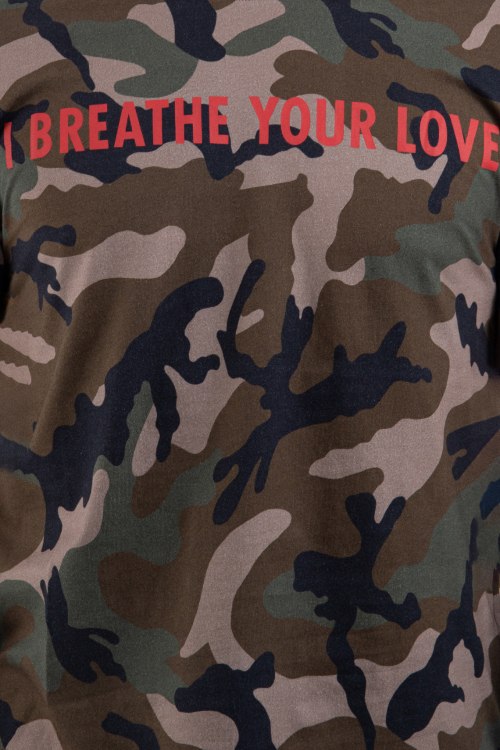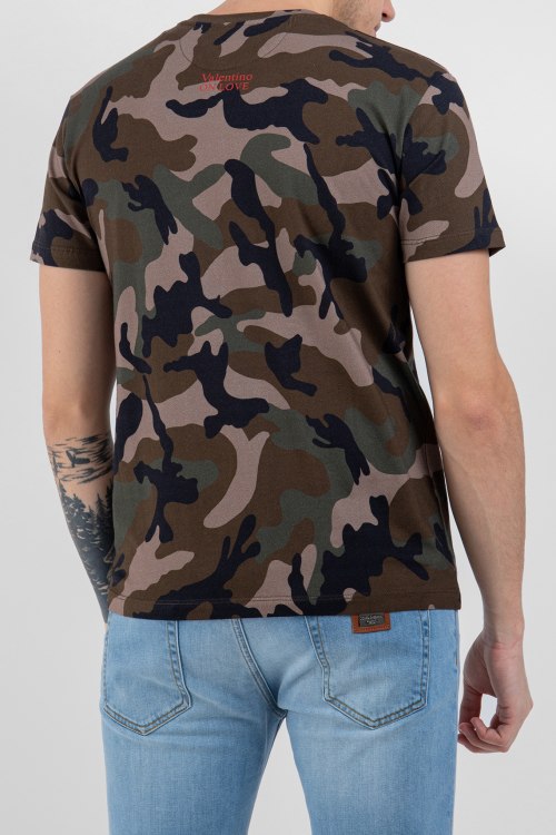 Детали: Мужская хлопковая футболка цвета хаки от Valentino (Валентино). Камуфляжный принт с надписью, круглый вырез горловины, короткий рукав