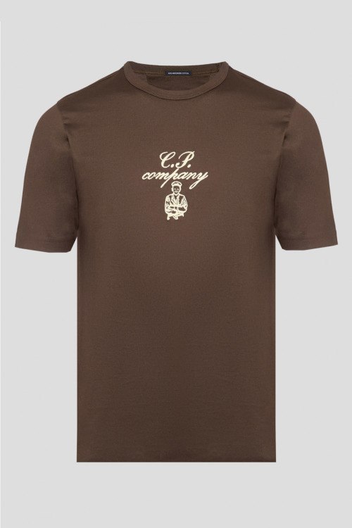 Детали: Мужская коричневая футболка из хлопка от C.P. Company (СиПи Компани). Классическая длина, круглый вырез горловины, короткие рукава, вышитый логотип бренда на груди. Замеры: длина рукава: короткий, для размера М - 25,5 см, обхват груди: для размера М - 112 см, обхват талии: для размера М - 108 см, длина изделия по среднему шву спинки от горловины: для размера М - 70 см