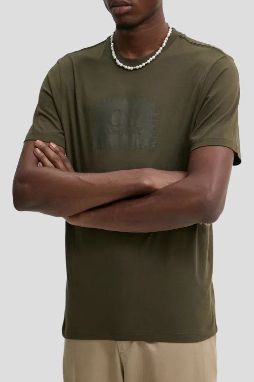Детали: Мужская коричневая футболка из хлопка от C.P. Company (СиПи Компани). Классическая длина, круглый вырез горловины, короткие рукава, брендированный принт на груди