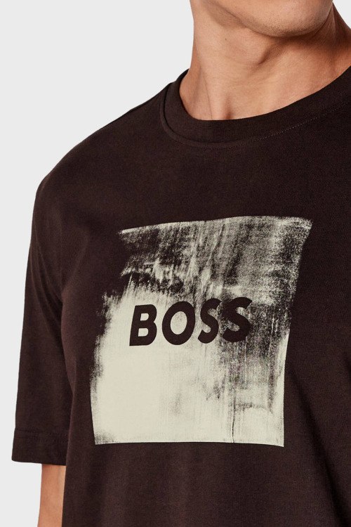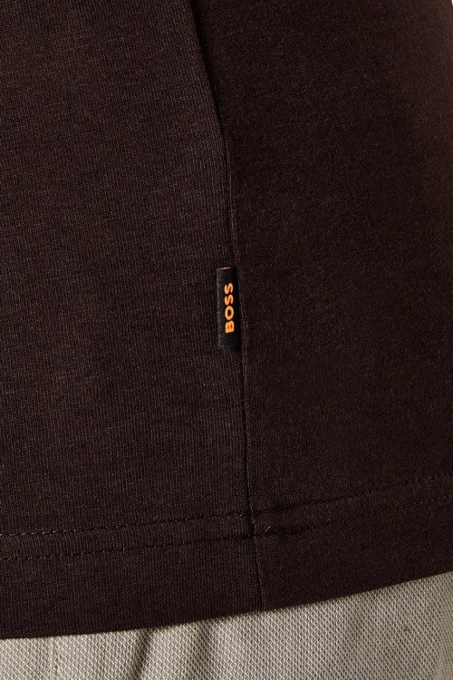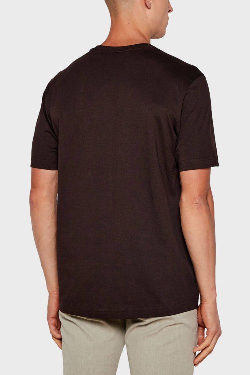Детали: Мужская темно-коричневая хлопковая футболка Te_Wheel от Hugo Boss (Хуго Босс). Логотип на груди, круглый вырез горловины, короткий рукав, классическая длина