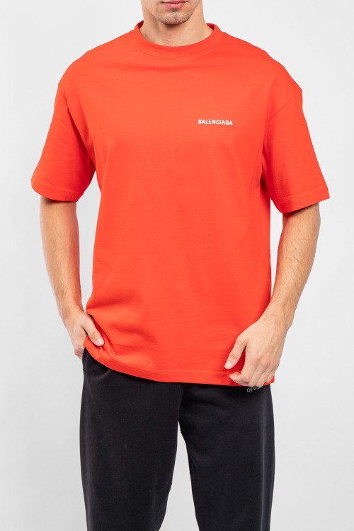 Мужская красная хлопковая футболка от Balenciaga (Баленсиага). Логотип на груди и на спине, круглый вырез горловины, короткий рукав, классическая длина.