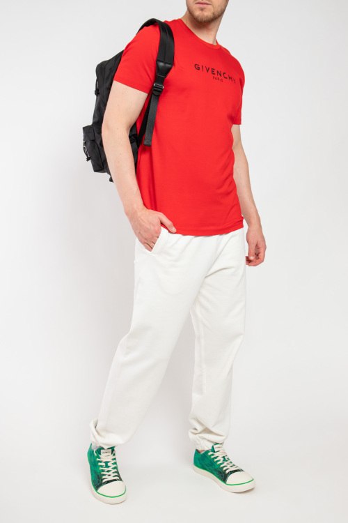 Мужская красная хлопковая футболка от Givenchy (Живанши). Принт с логотипом на груди, круглый вырез горловины, короткий рукав, классическая длина