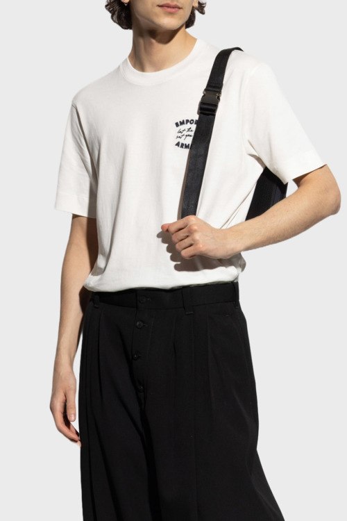 Детали: Мужская футболка молочного оттенка из хлопка от Emporio Armani (Эмпорио Армани). Классическая длина, круглый вырез горловины, вышитый логотип бренда на груди