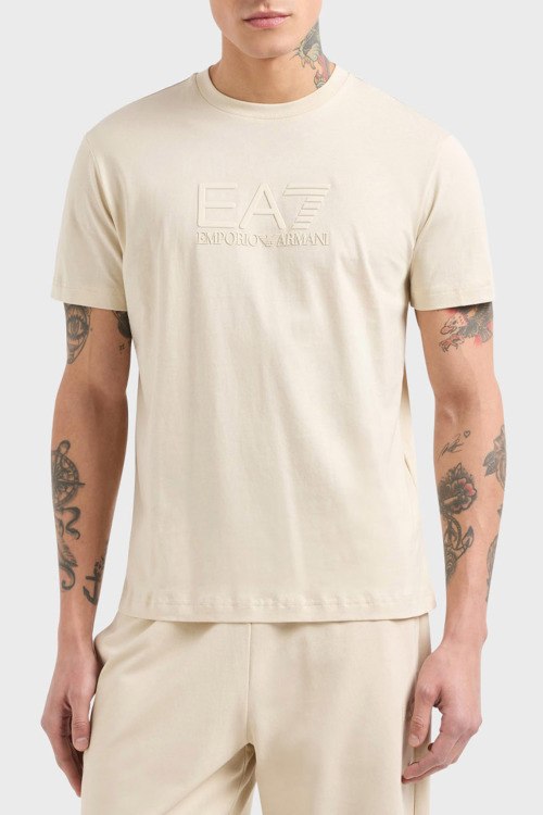 Детали: Мужская хлопковая футболка молочного оттенка от EA7 Emporio Armani (ЕА7 Эмпорио Армани). Логотип на груди, круглый вырез горловины, короткий рукав, классическая длина