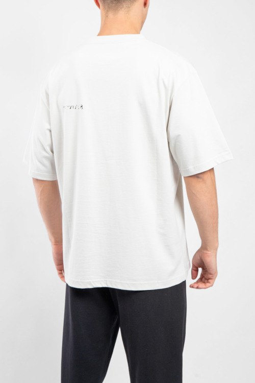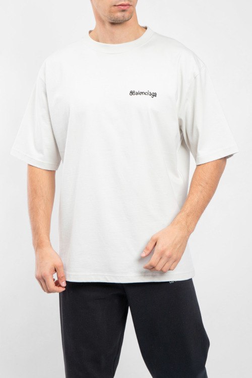 Мужская хлопковая футболка молочного оттенка от Balenciaga (Баленсиага). Логотип на груди, круглый вырез горловины, короткий рукав, классическая длина.