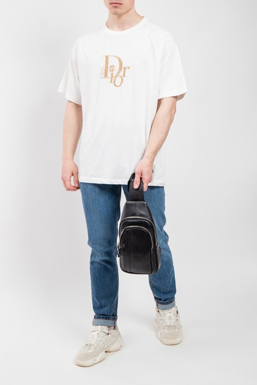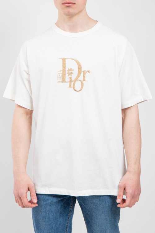 Мужская футболка молочного оттенка из хлопка от Christian Dior (Кристиан Диор). Классическая длина, круглый вырез горловины, короткие рукава, вышитый логотип бренда на груди.