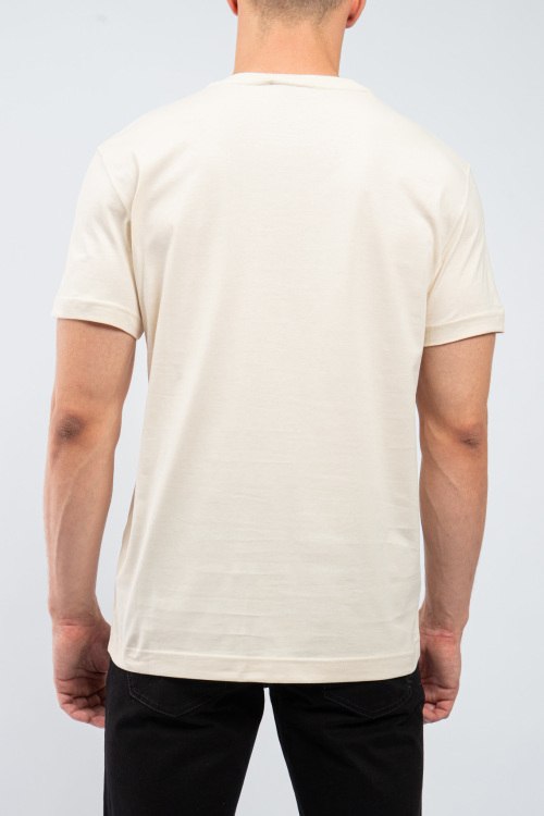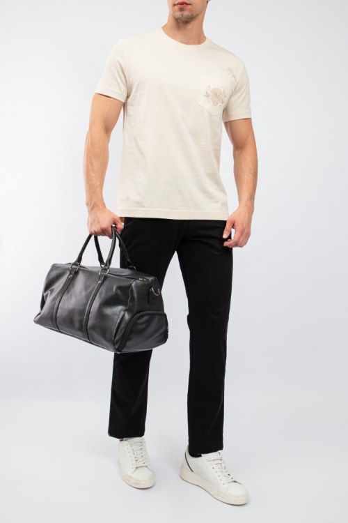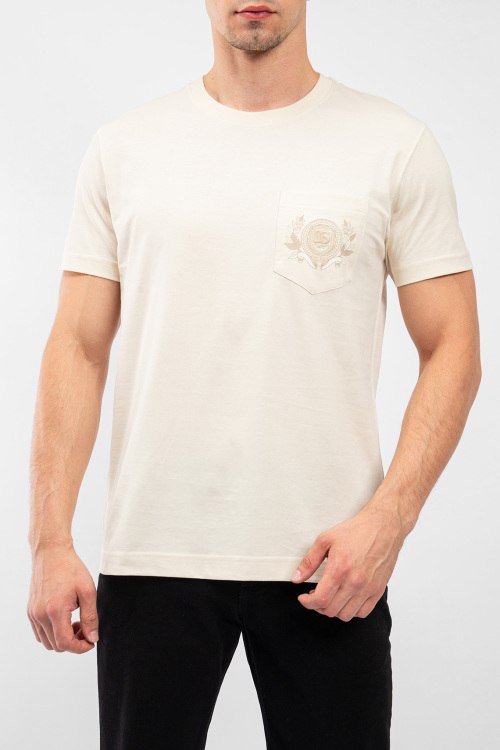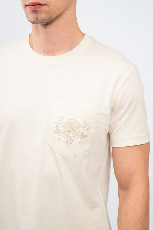 Детали: Мужская хлопковая футболка молочного оттенка от Dolce & Gabbana (Дольче энд Габбана). Карман на груди с вышитым логотипом, круглый вырез горловины, короткий рукав, классическая длина