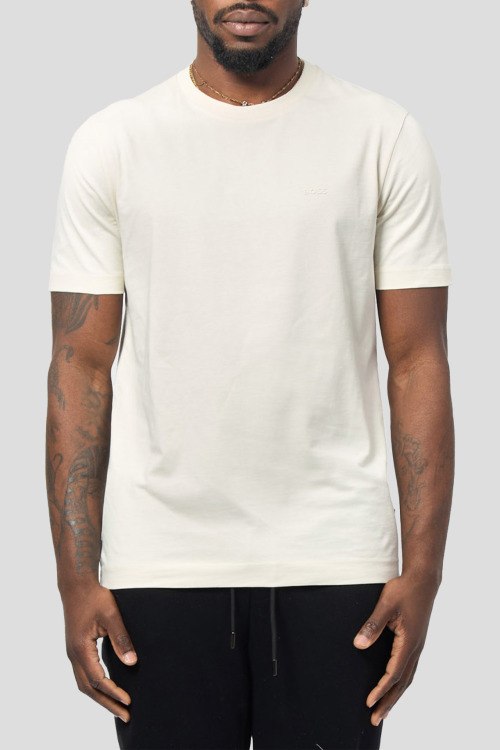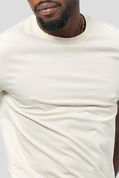 Детали: Мужская хлопковая футболка молочного оттенка Thompson от Hugo Boss (Хуго Босс). Логотип на груди, круглый вырез горловины, короткий рукав, классическая длина