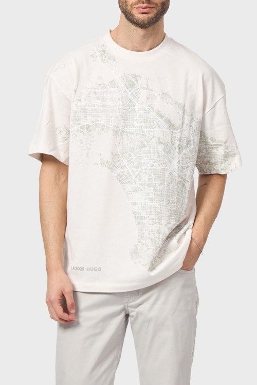 Детали: Мужская хлопковая футболка молочного оттенка Duglow от Hugo by Hugo Boss (Хуго бай Хуго Босс). Принт по всей поверхности, круглый вырез горловины, короткий рукав, классическая длина