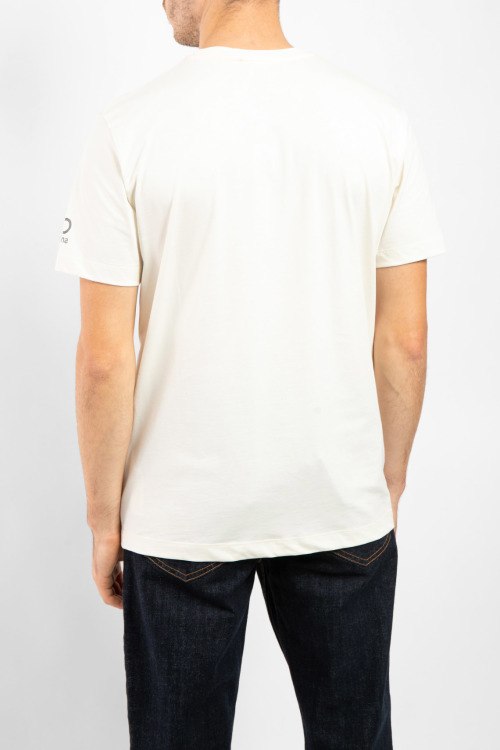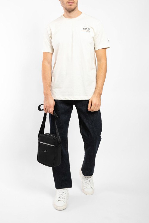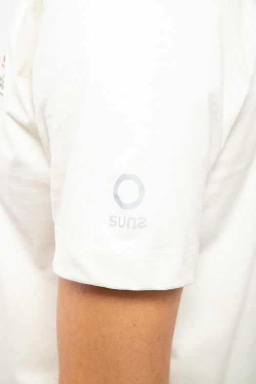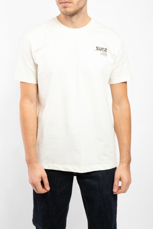Мужская футболка молочного оттенка из хлопка от Suns Boards (Санс Боадс). Круглый вырез горловины, короткие рукава брендированный принт на рукаве и на груди.