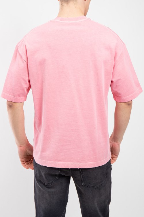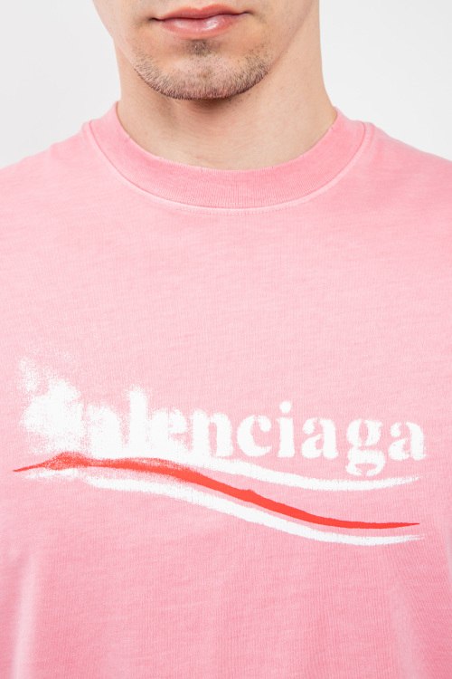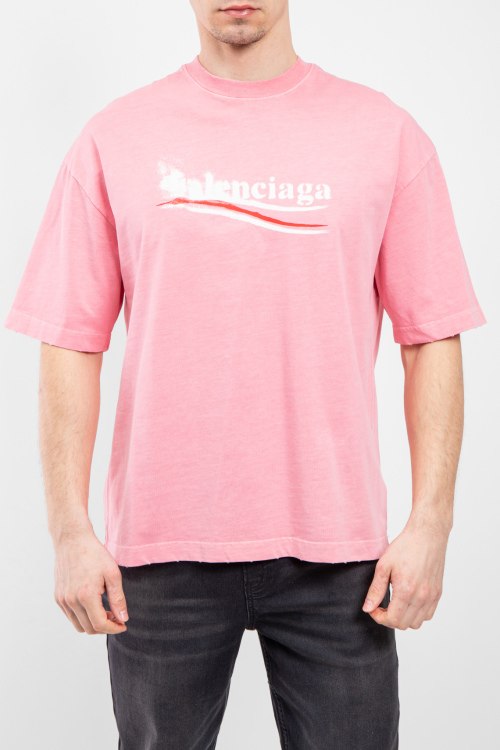 Мужская розовая футболка из хлопка от Balenciaga (Баленсиага). Классическая длина, круглый вырез горловины, короткие рукава, брендированный принт на груди.