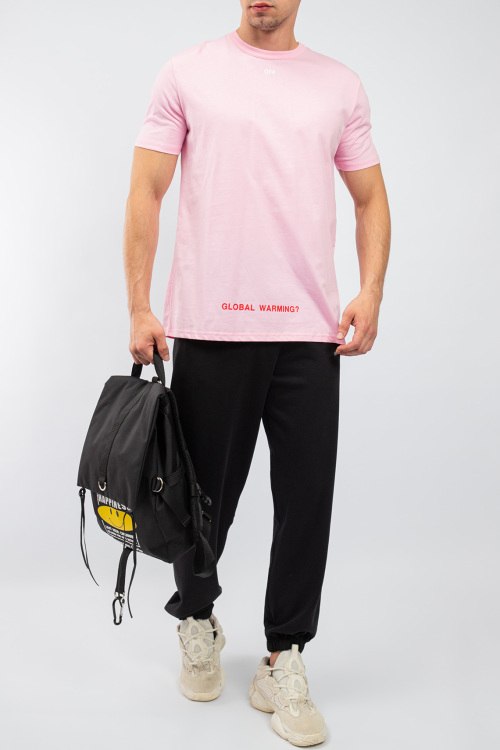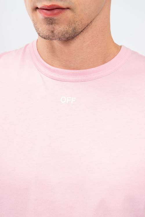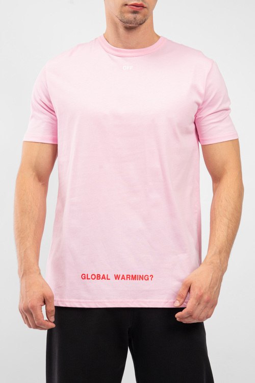 Мужская розовая хлопковая футболка от Off-White (Офф-Вайт). Принт спереди и сзади, круглый вырез горловины, короткий рукав, классическая длина.