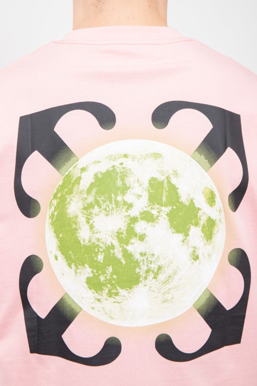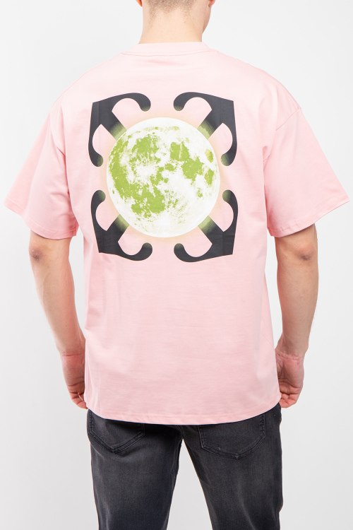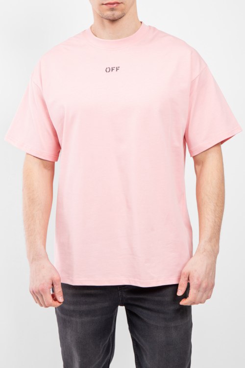 Мужская розовая футболка Camiseta из хлопка от Off-White (Офф-Вайт). Классическая длина, круглый вырез горловины, короткие рукава, декорирована принтом на спине, лого на груди.