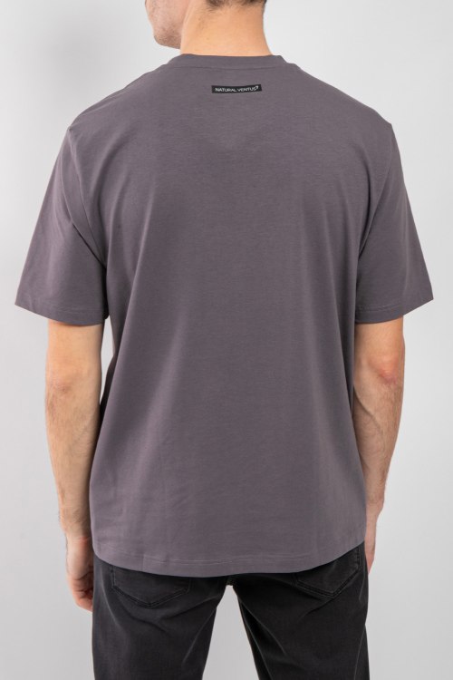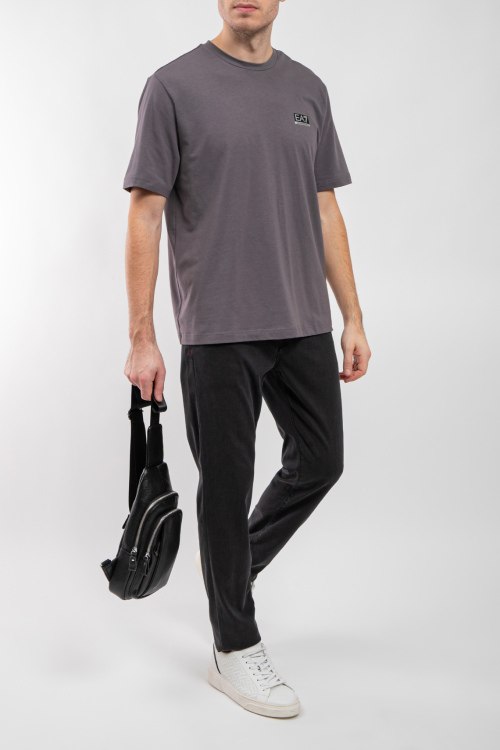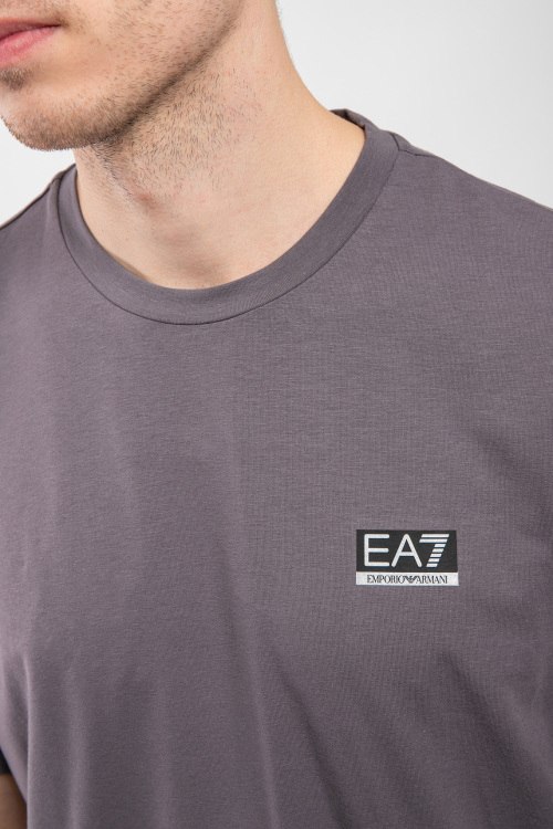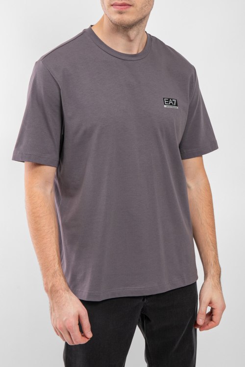 Мужская серая футболка из хлопкового микса от EA7 Emporio Armani (ЕА7 Эмпорио Армани). Принт с логотипом на груди, круглый вырез горловины, короткий рукав, классическая длина.