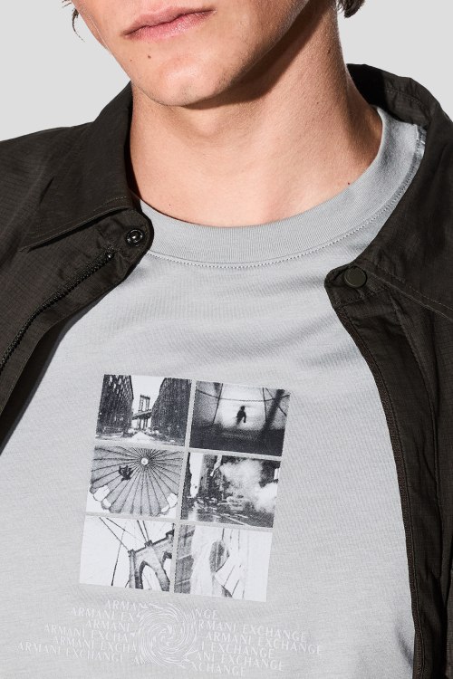 Детали: Мужская серая хлопковая футболка от Armani Exchange (Армани Эксчендж). Принт на груди, круглый вырез горловины, короткий рукав, классическая длина