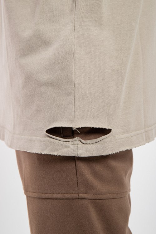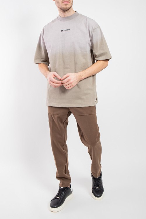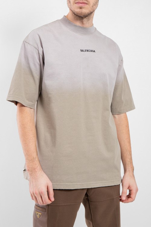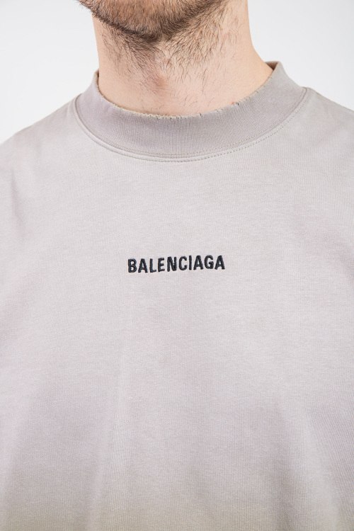 Мужская серая футболка из хлопка от Balenciaga (Баленсиага). Классическая длина, круглый вырез горловины, рваные детали, дизайн с градиентом, принт на груди.