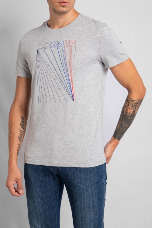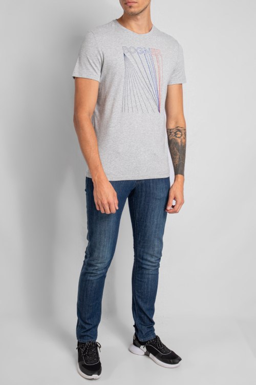 Мужская серая хлопковая футболка от Bogner (Богнер). Принт с логотипом, круглый вырез горловины, короткий рукав.