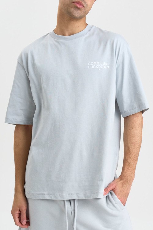 Детали: Мужская светло-серая хлопковая футболка от Comme des Fuckdown (Камм дес Факдаун). Логотип на груди и на спине, круглый вырез горловины, короткий рукав, классическая длина. Параметры модели: 97 см - 78 см - 96 см. Рост - 188 см. Размер на фото - L