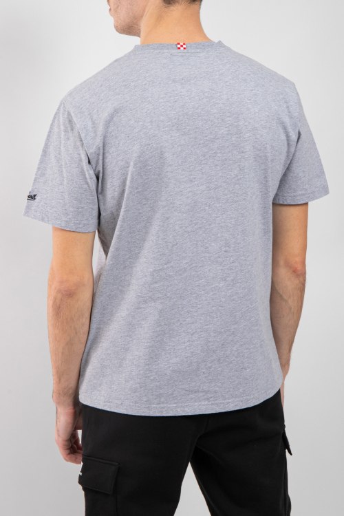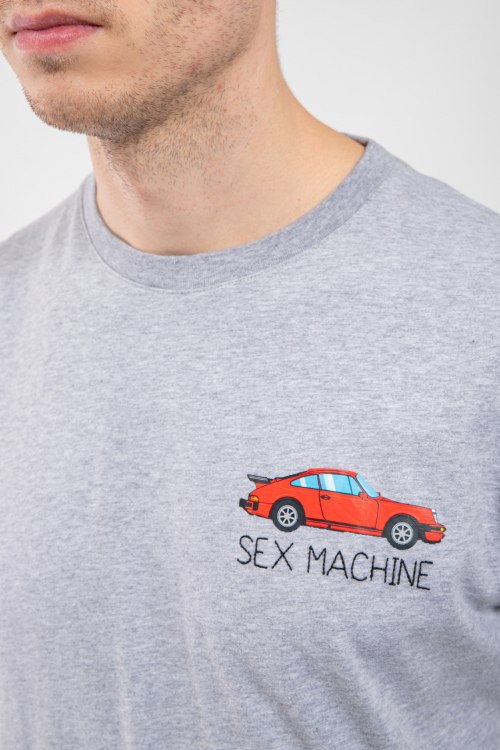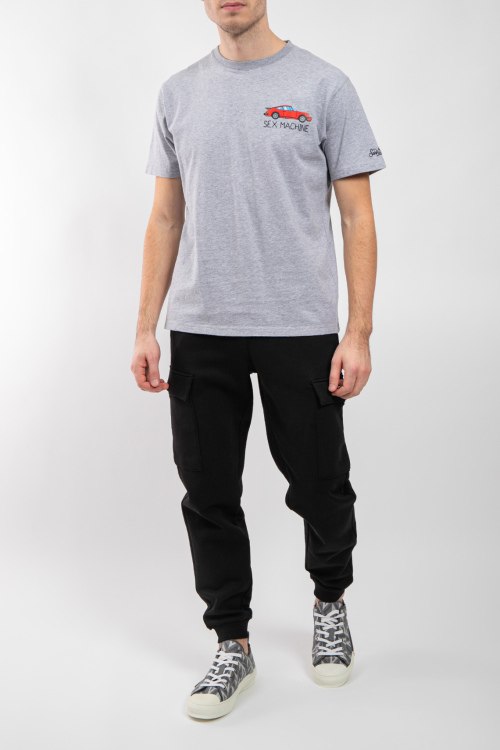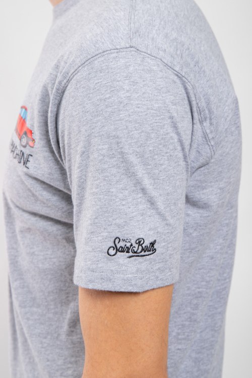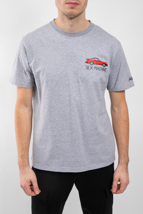 Мужская серая хлопковая футболка Sex Machine от Mc2 Saint Barth (Mc2 Сент Барт). Вышивка на груди и на рукаве, круглый вырез горловины, короткий рукав, классическая длина.