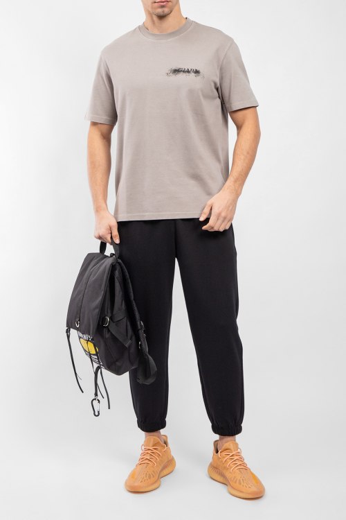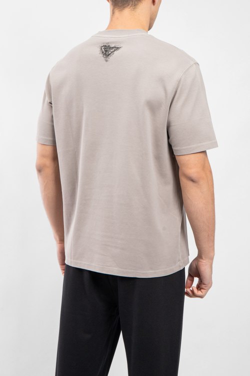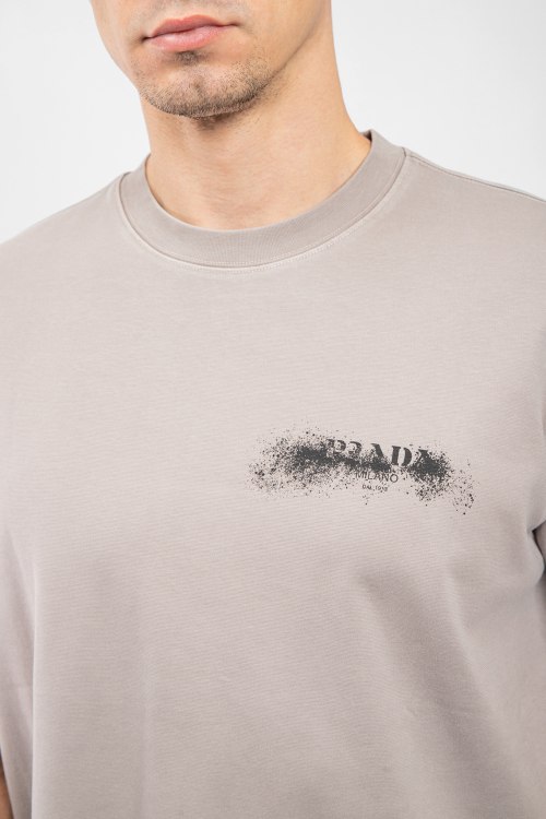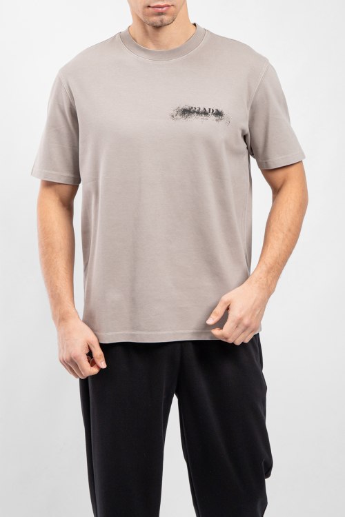 Мужская хлопковая футболка цвета тауп от Prada (Прада). Логотип на груди и на спине, круглый вырез горловины, короткий рукав, классическая длина.