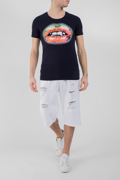 Мужская темно-синяя хлопковая футболка от Antony Morato (Энтони Морато). Средняя длина, круглый вырез горловины, короткие рукава, спереди яркий принт.