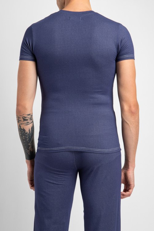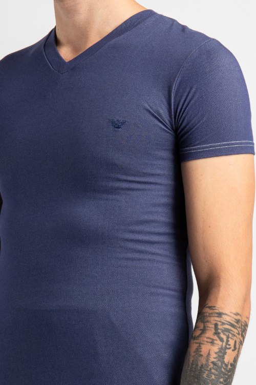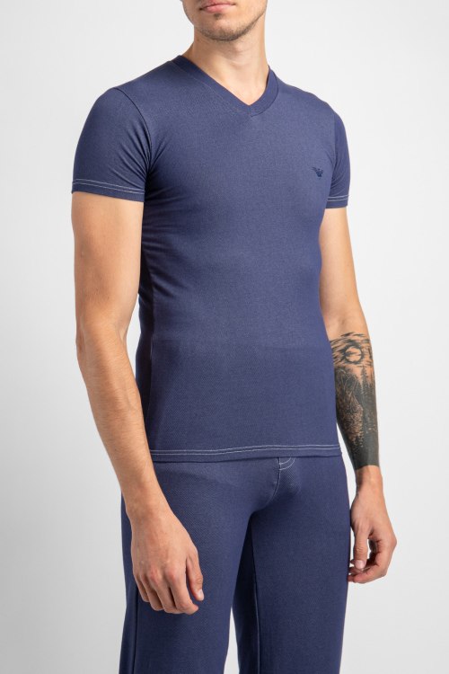 Мужская синяя футболка из хлопкового микса от Emporio Armani (Эмпорио Армани). V-образный вырез горловины, короткий рукав, принт с логотипом бренда на груди, классическая длина.