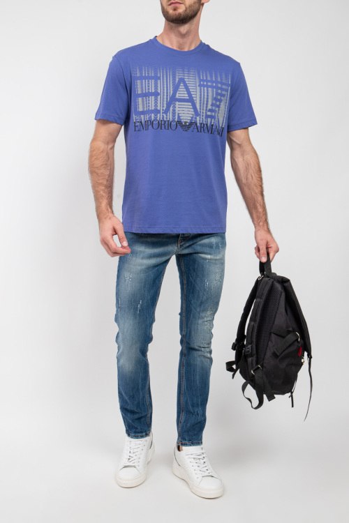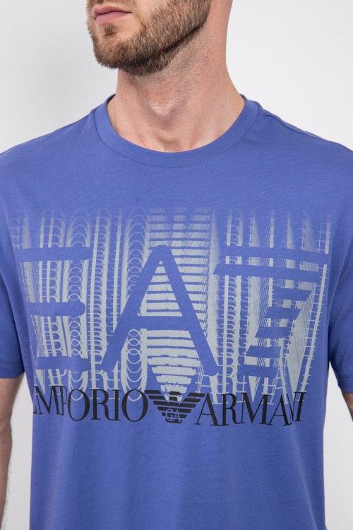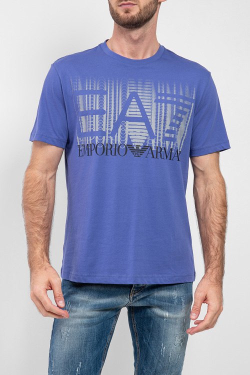 Мужская синяя хлопковая футболка от Armani (Армани). Принт с логотипом на груди, круглый вырез горловины, короткий рукав, классическая длина.
