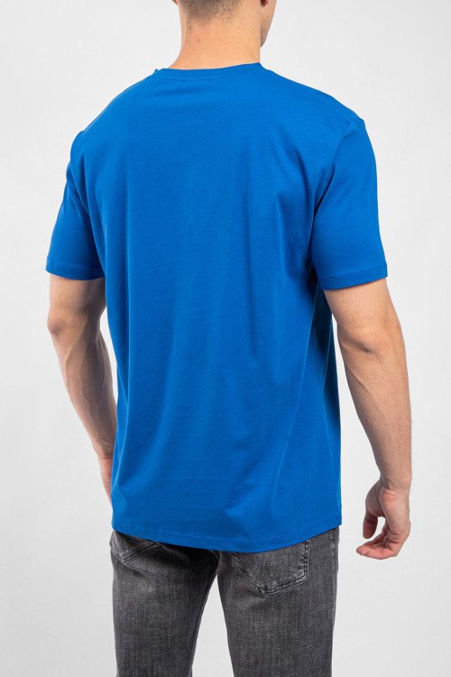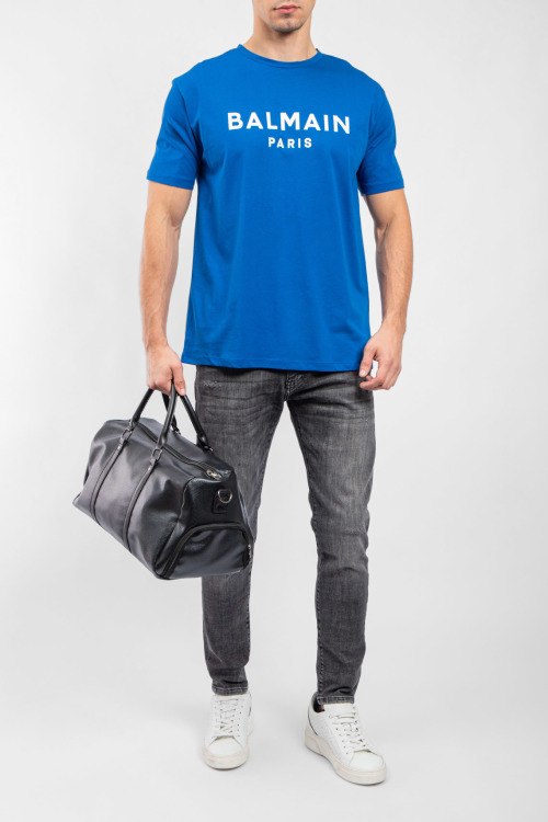 Мужская синяя хлопковая футболка от Balmain (Бальман). Принт с логотипом на груди, круглый вырез горловины, короткий рукав, классическая длина.