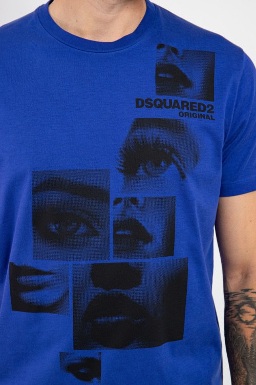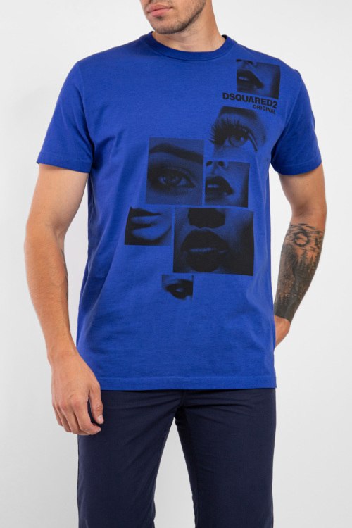 Детали: Мужская синяя хлопковая футболка от Dsquared2 (Дискваред). Принт спереди, круглый вырез горловины, короткий рукав, классическая длина