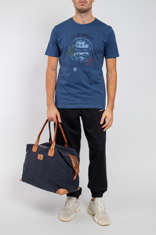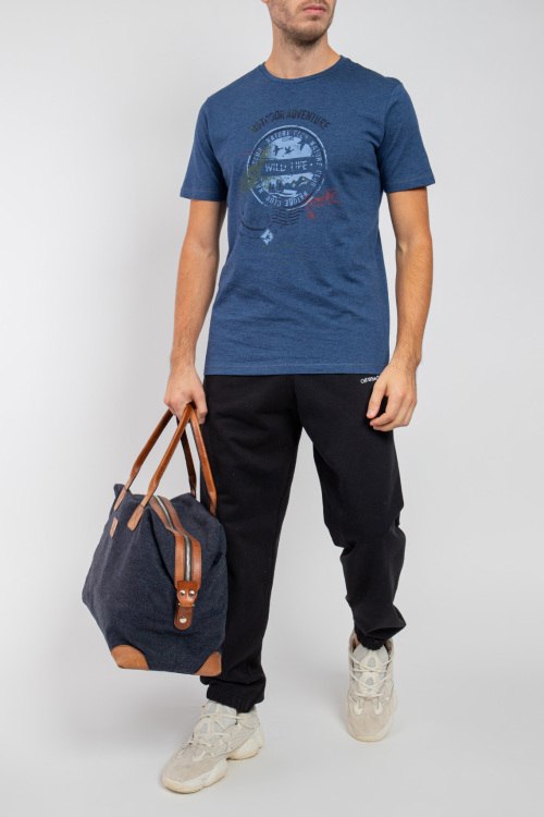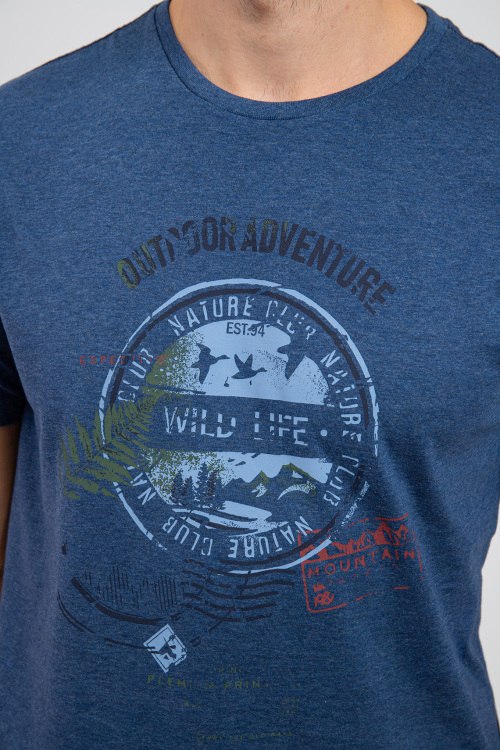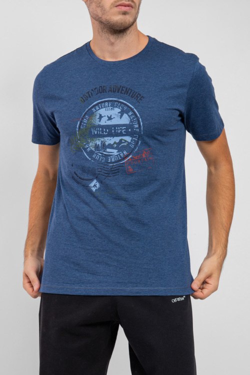 Мужская синяя хлопковая футболка Wild Life от Marvelis (Марвелис). Принт на груди, круглый вырез горловины, короткий рукав, классическая длина. Замеры для размера М: длина 74 см, полу обхват груди 54 см, длина рукава 23 см.