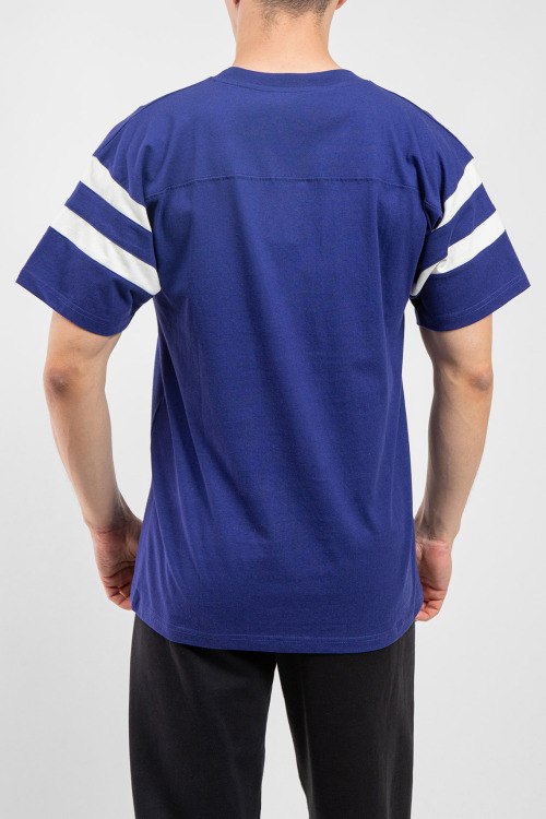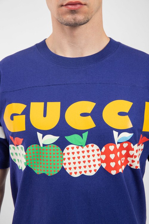 Мужская синяя футболка из хлопка от Gucci (Гуччи). Классическая длина, круглый вырез горловины, короткие рукава, брендированный принт спереди.