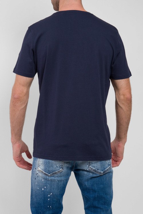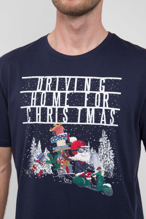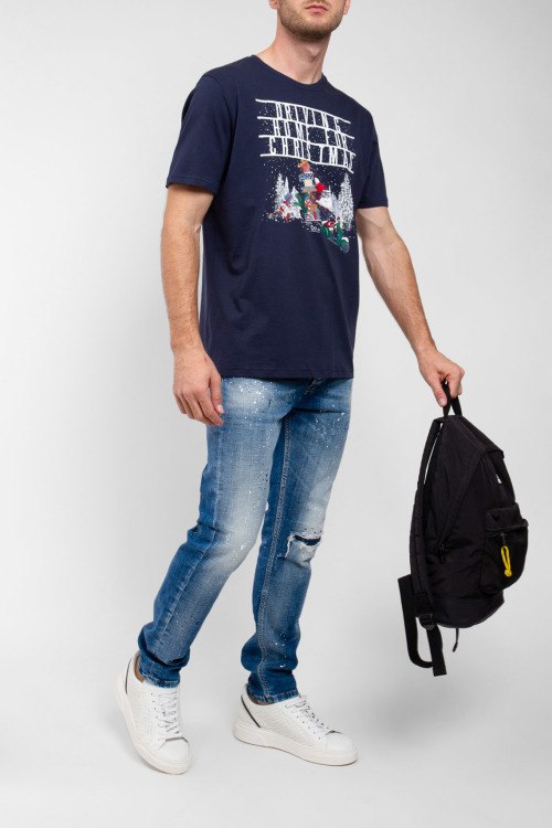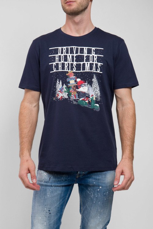 Детали: Мужская темно-синяя футболка из хлопка от Marvelis (Марвелис). Дизайн с новогодним принтом, круглый вырез горловины, короткие рукава, ровный низ изделия