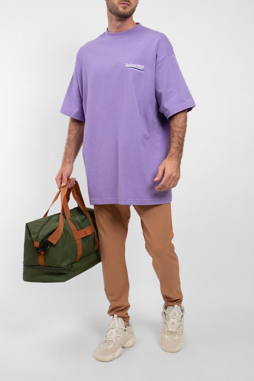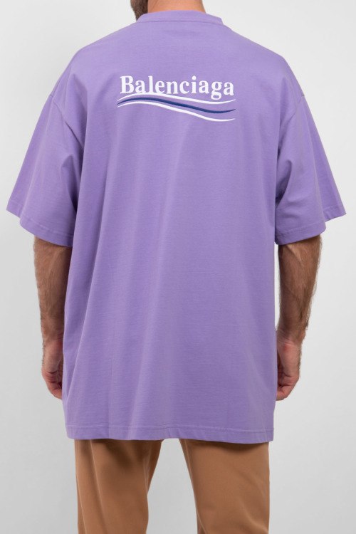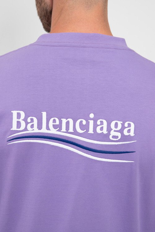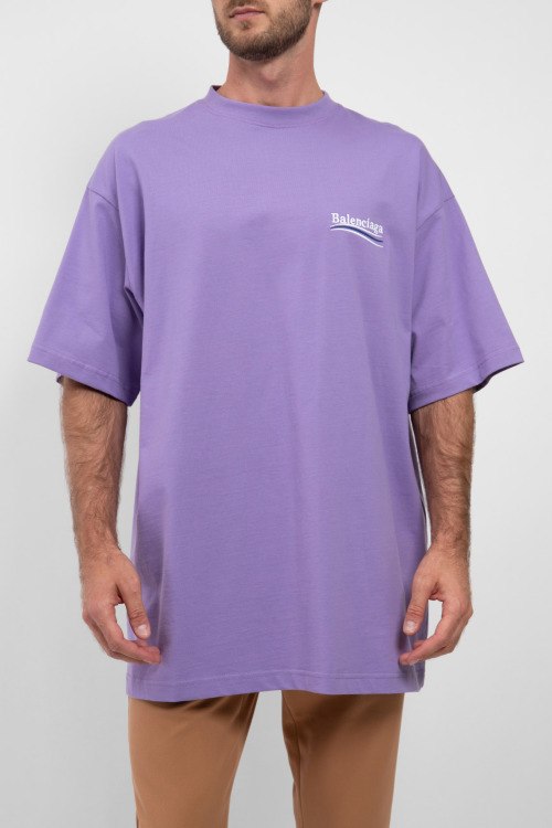 Мужская сиреневая футболка из хлопка от Balenciaga (Баленсиага). Классическая длина, круглый вырез горловины, короткие рукава, дизайн с вышитым логотипом бренда спереди и на спине.