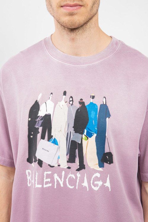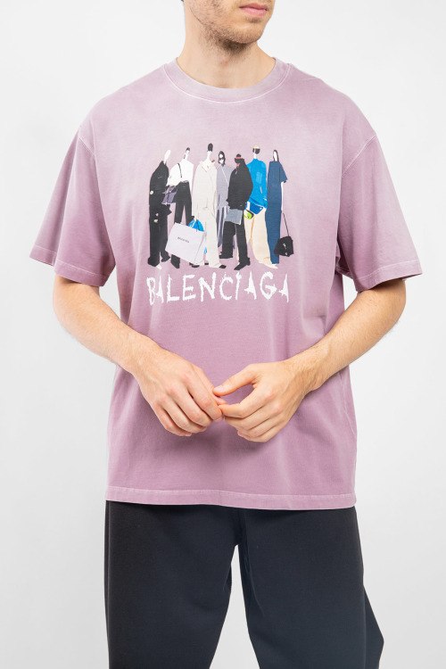 Мужская сиреневая хлопковая футболка от Balenciaga (Баленсиага). Принт на груди, круглый вырез горловины, короткий рукав, классическая длина.