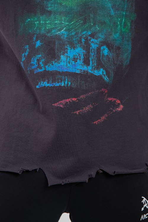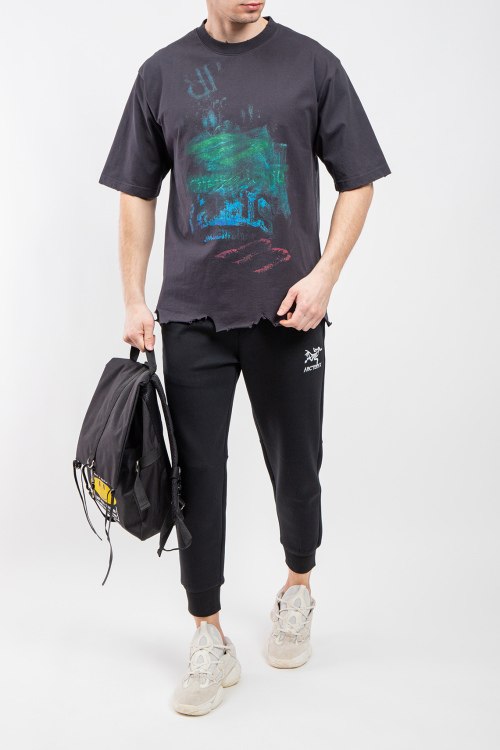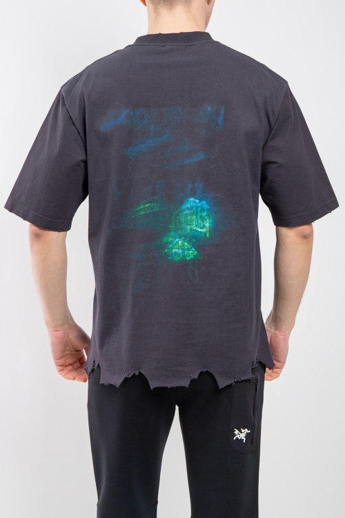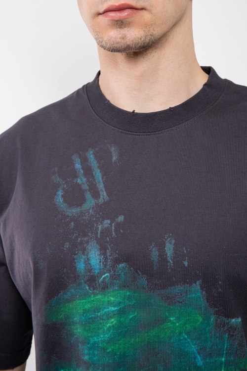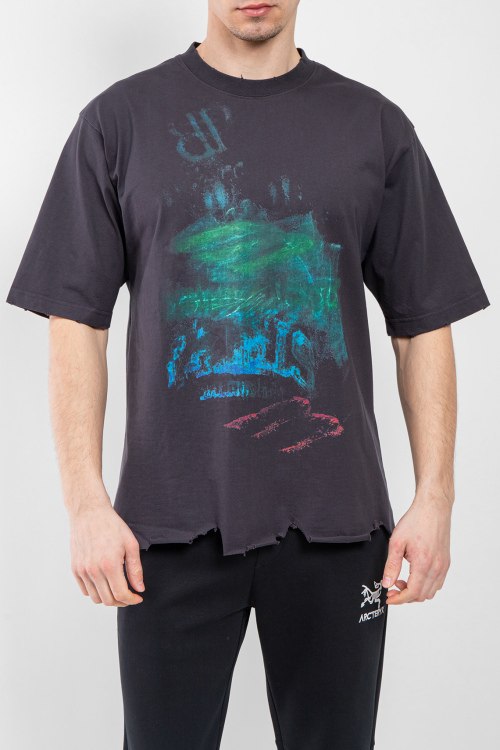 Мужская темно-серая футболка из хлопка от Balenciaga (Баленсиага). Классическая длина, круглый вырез горловины, короткие рукава, графический принт спереди, необработанный нижний край.