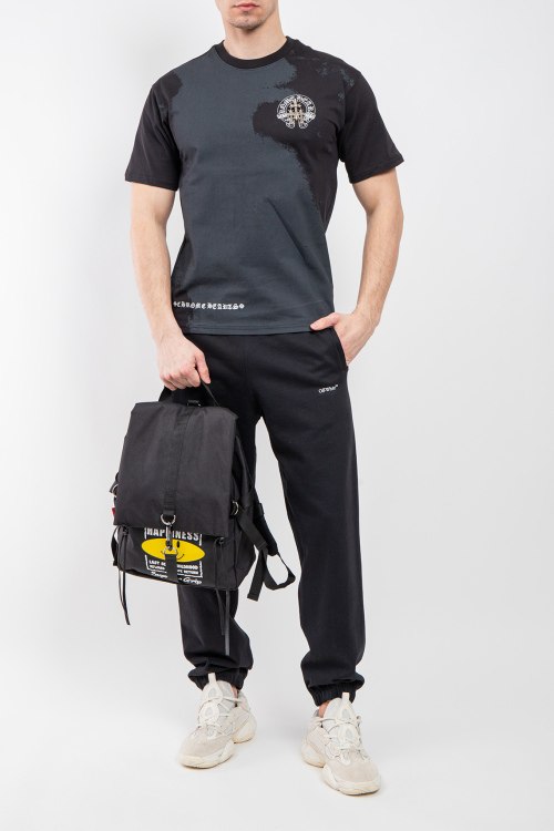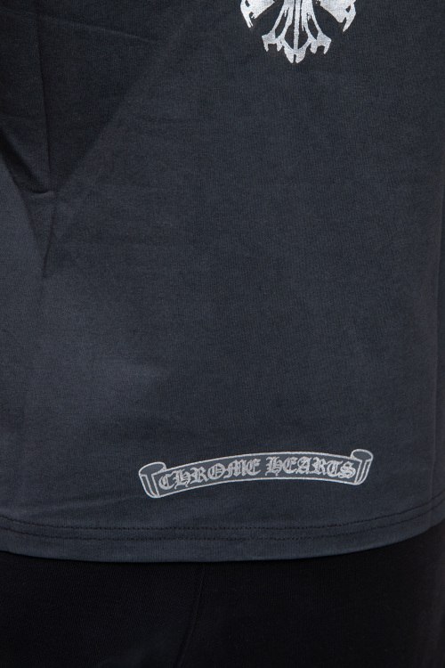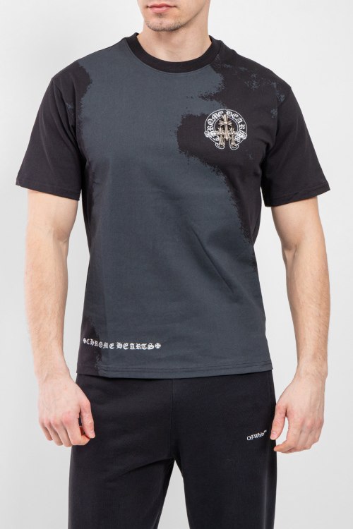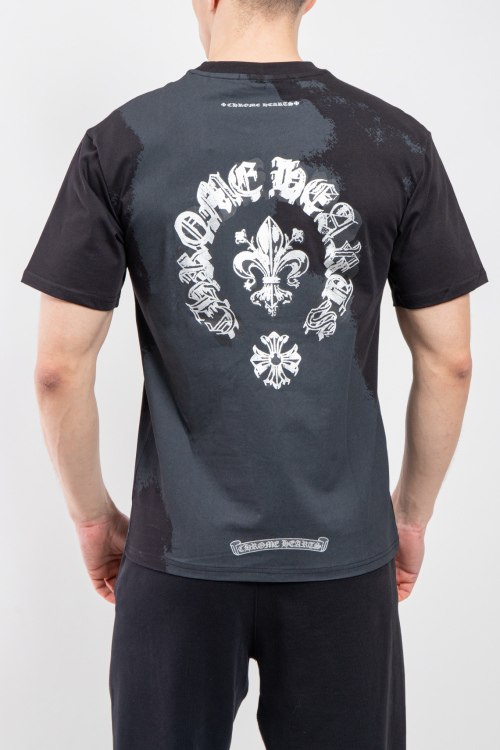Мужская темно-серая футболка из хлопка от Chrome Hearts (Хром Нартс). Круглый вырез горловины, короткие рукава, классическая длина, дизайн с принтом на спине и на груди.